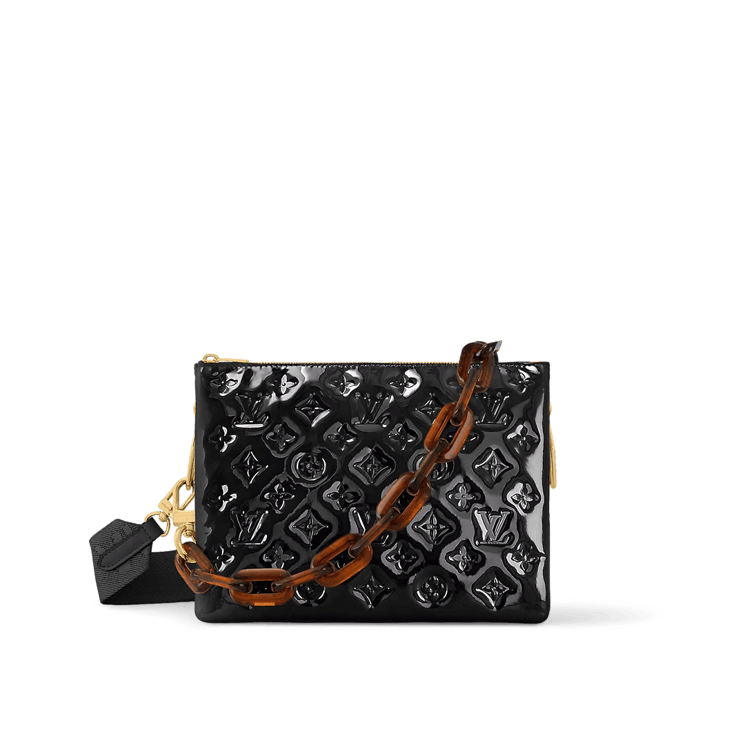 This louis vuitton Coussin PM handbag is part of the Monogram Glazed capsule, inspired by 70s vintage car seat covers. The glazed rendering of the puffy embossed calfskin gives a glow to the leather, emphasizing the Monogram pattern. The tortoise resin chain evokes the woodwork found in luxurious vintage cars.