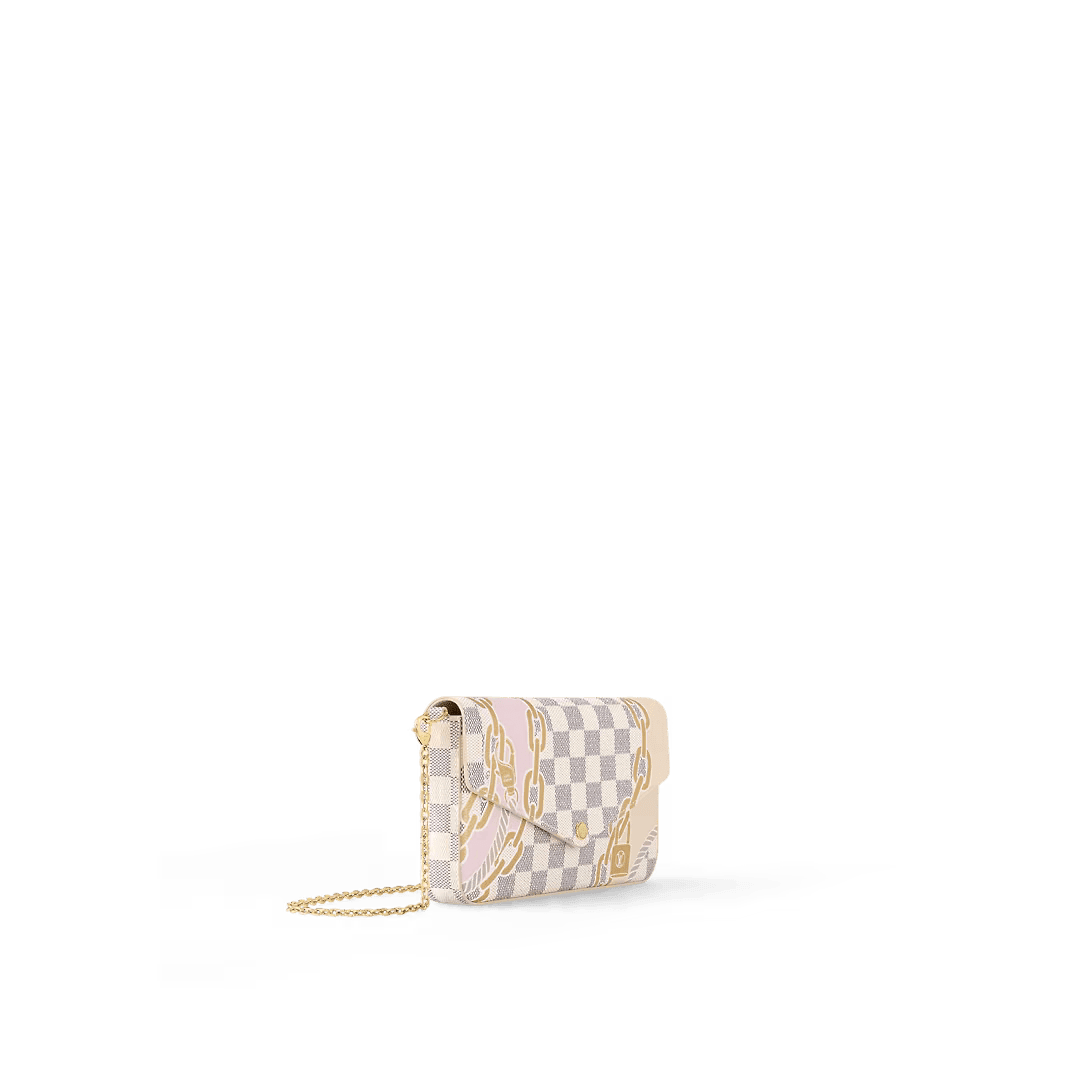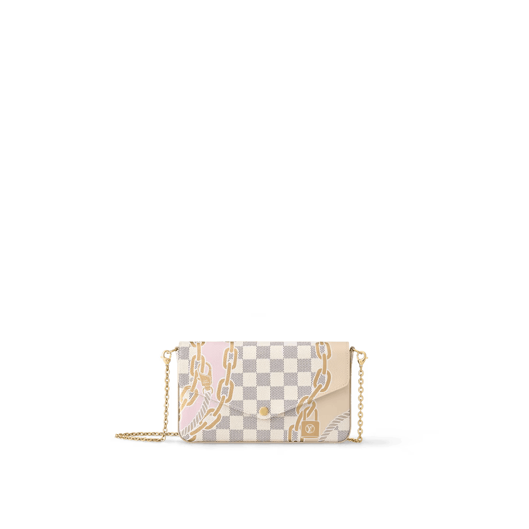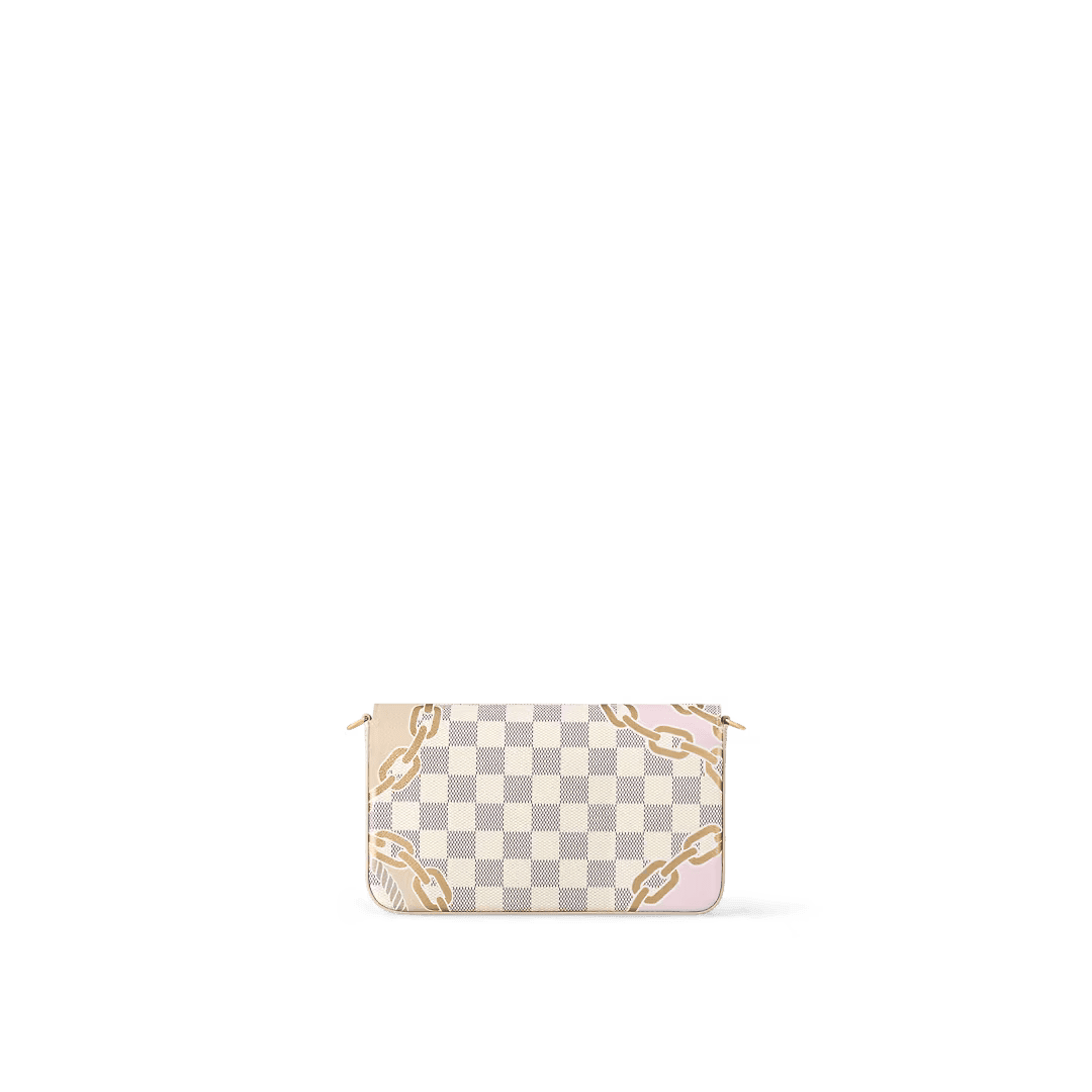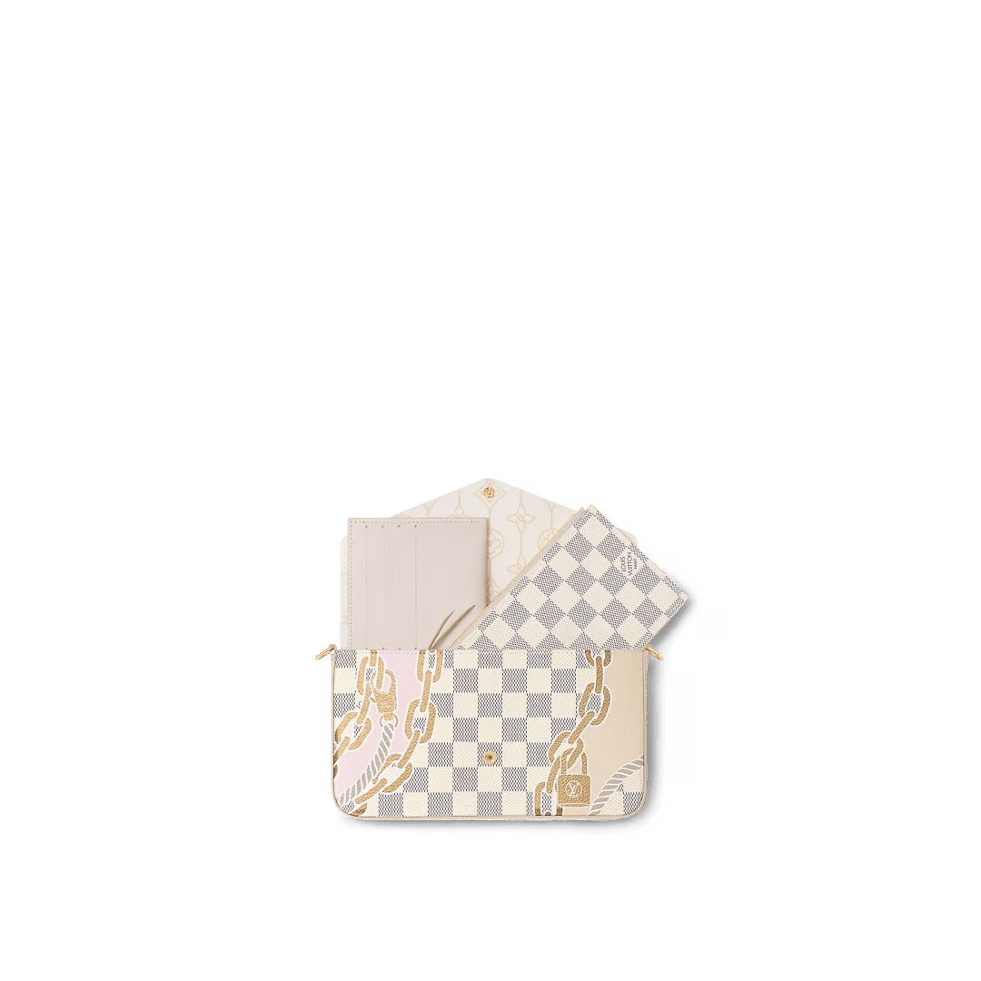 The louis vuitton Felicie Pochette is made from Damier Azur canvas overlaid with a bold graphic print inspired by the world of travel so dear to Louis Vuitton. The summery motif, a nautical pattern made of ropes and chains, in fresh feminine colors with golden highlights, brings a playful yet chic feel to this practical pouch.
