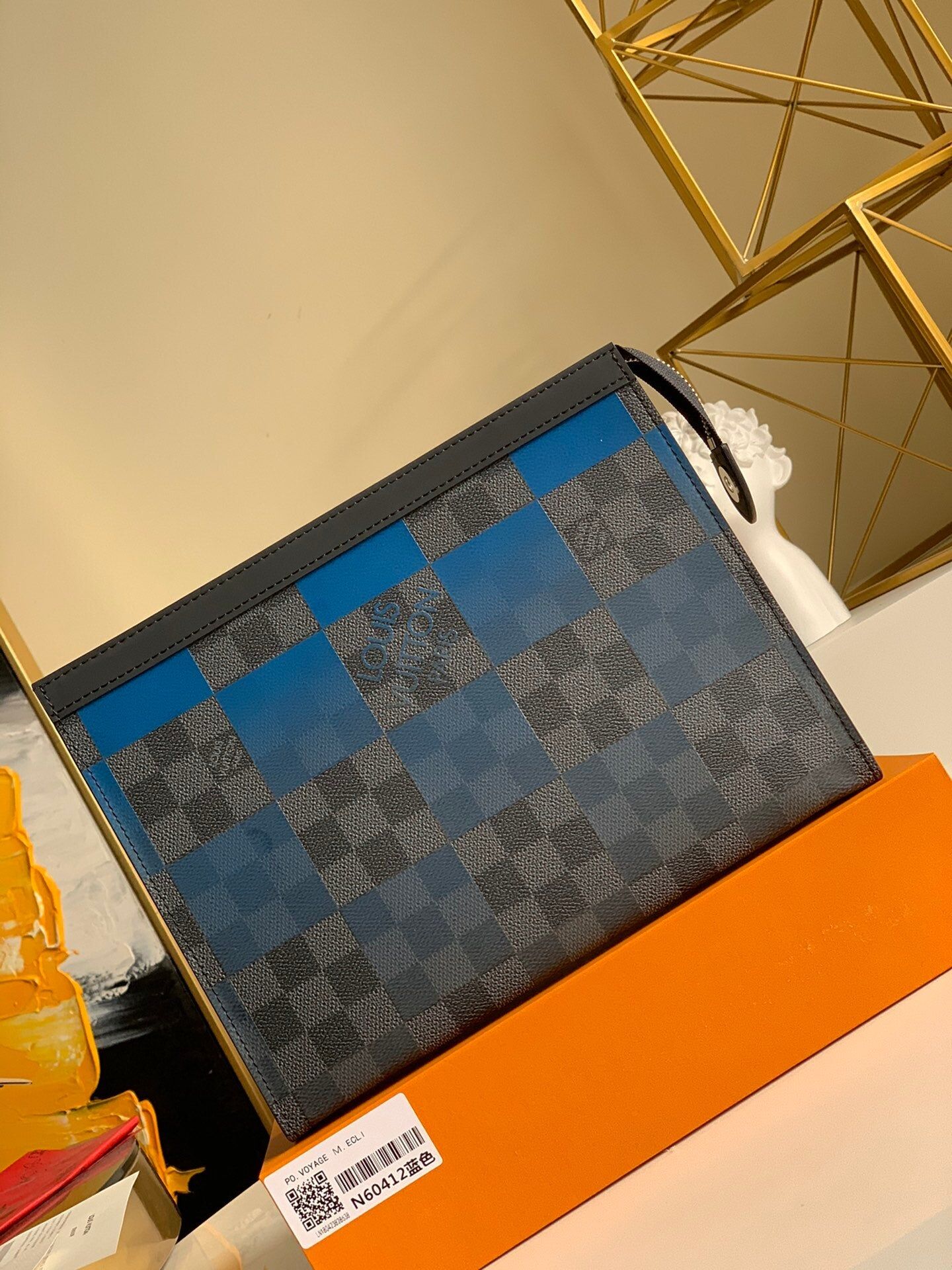 The Pochette Voyage has been updated with Damier Graphite Giant canvas, a new take on the House?s classic checked pattern in handsome shades of blue. Easy to hand-carry or slip into a suitcase, it?s a versatile travel accessory ? a smart and stylish way to pack cash, cards, a phone and other small necessities.
