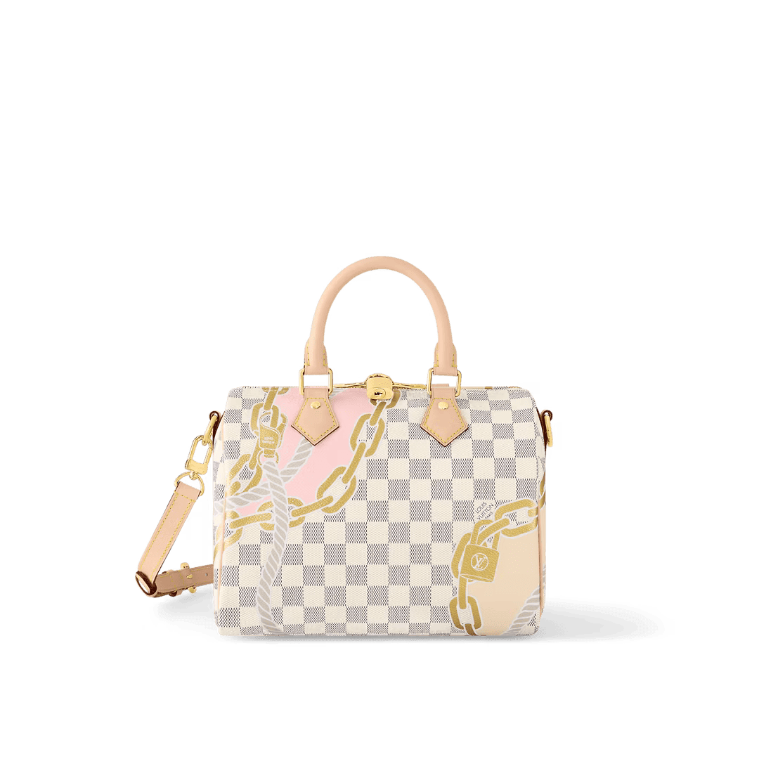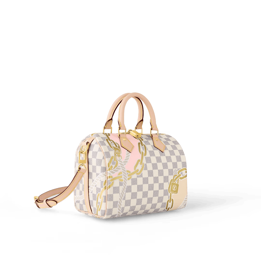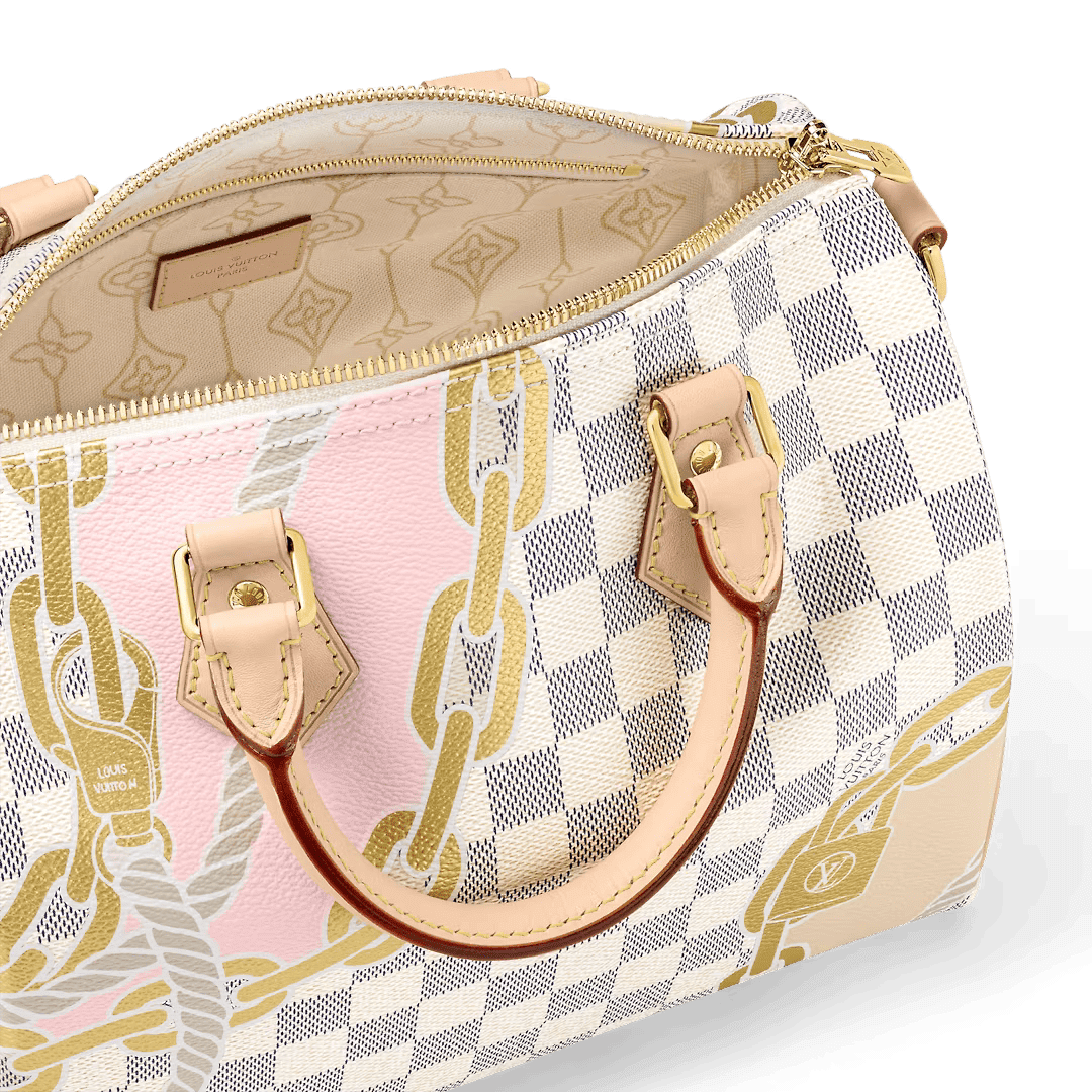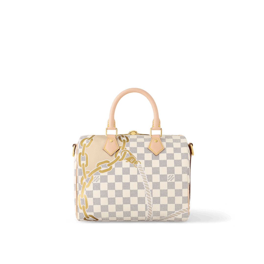 The Speedy Bandoulière 25 handbag gets a summery makeover in Damier Azur canvas decorated with a bold nautical print. The 5-color serigraphy of chains and ropes with golden highlights brings a distinct resort feel to the bag. Two rolled-leather top handles and a removable and adjustable strap give carry options.